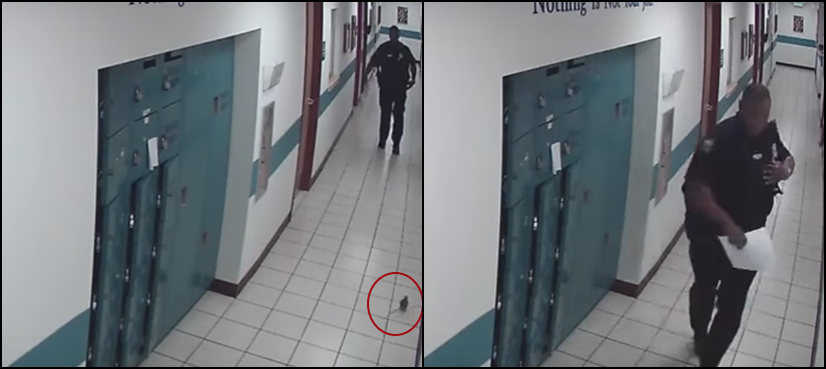 Touted as a CCTV capture from the St Petersburg Police Department in Florida, this video – that’s doing the rounds in social media – shows the brawny officer’s rendezvous with a tiny rodent, in which not only does he run away from it, but also comes back treading steadily and slowly to check if the rat is still around.