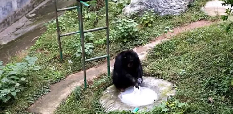 The chimpanzee headed directly to wash the T-shirt when brought near the pool along with its sister, and spent thirty minutes on the chore, the report added.