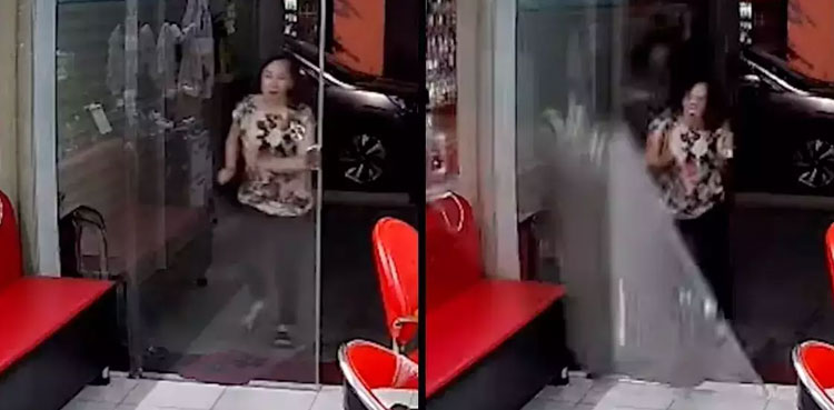 Woman breaks glass door after walking at it; video goes viral