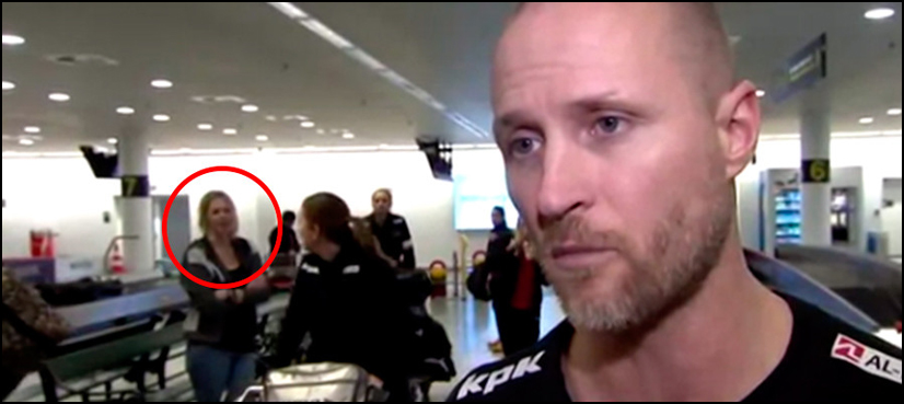 During an interview at an airport on the SportsCenter show on Denmark’s TV channel, a woman to the left of the frame in the background chats to another passenger as she awaits her luggage.