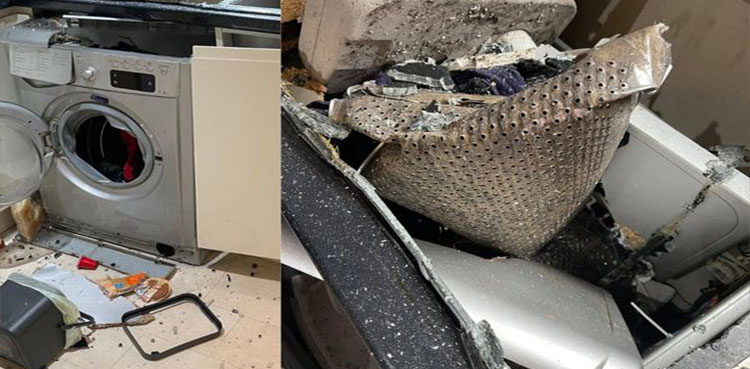 The pictures show the bunker top above the washing machine seems to have imploded. The top cover of the home appliance was also been blown apart, leaving large chunks of plastic and glass scattered all over the floor.