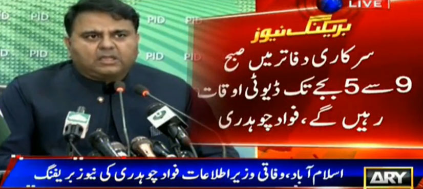 ISLAMABAD: Information Minister Fawad Chaudhry on Friday announced new office hours for government employees, a new policy for state television and austerity measures approved after a cabinet meeting chaired by Prime Minister Imran Khan, ARY News reported.