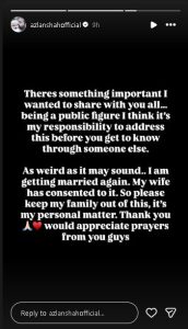 Taking to his Instagram story on Tuesday, November 25, Azlan revealed the news with his followers, emphasizing that this is his responsibility as a public figure to share it directly.