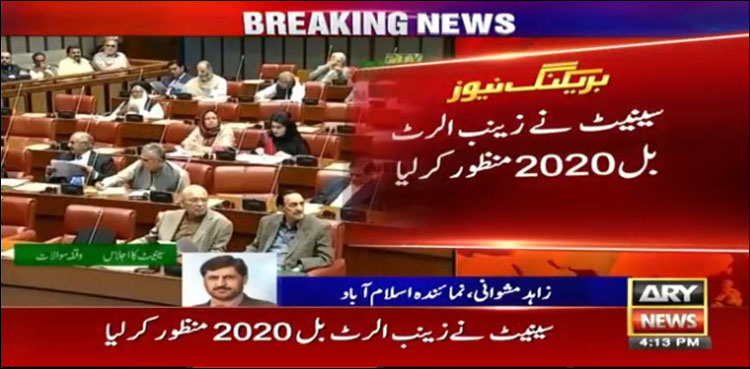 ISLAMABAD: The Senate of Pakistan on Wednesday passed Zainab Alert Bill 2020 which defines the law for the response and recovery of missing children, ARY News reported.