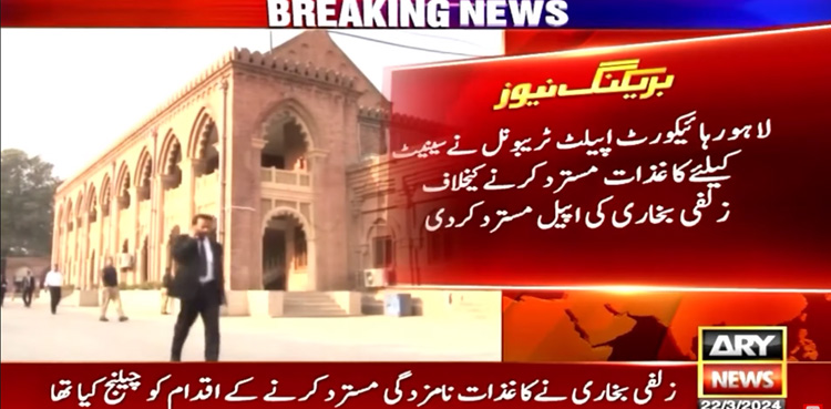 LAHORE: Lahore appellate tribunal on Friday rejected Pakistan Tehreek-e-Insaf (PTI) leader Zulfi Bukhari’s plea, challenging the rejection of his nomination papers for senate elections, ARY News reported.